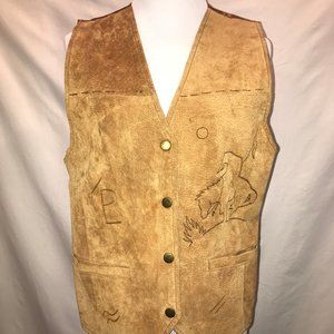 Vintage leather vest in very good condition. Very unique Native American pattern embroidered into the left panel.