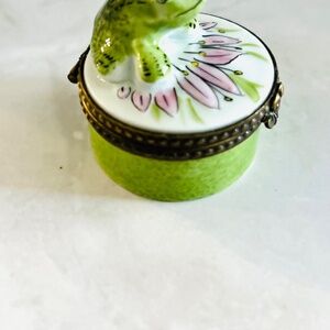 This exceptional hand-painted Limoges trinket box from France features an enchanting spotted frog perched atop a beautifully detailed floral base that will captivate any serious collector. The artistry is extraordinary - from the frog's realistic spotted markings to the exquisite pink and purple florals painted both inside and outside the box.
