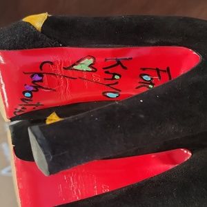 Authentic Loubatin Viva Bella Peacock suede pumps. It has Christian Louboutin's autograph on one of the pairs (super cool)! It has signs of wear inside and outside soles but no major call outs to mention. It doesn't come with box. Size 37.