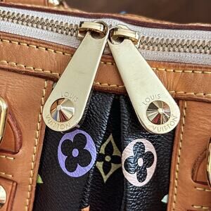 Chic Louis Vuitton satchel with vibrant multicolor monogram. Features gold-tone studs and tan leather accents. Perfect for a bold statement.