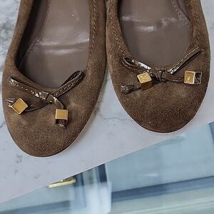 Authentic Louis Vuitton Brown Suede Slip on Flats Size 36. Excellent Condition - no signs of wear on bottoms. Gold Hardware. Vernis/ patent leather Bow. Comes with Dustbag.