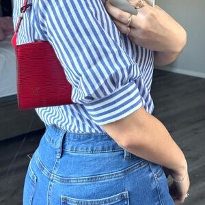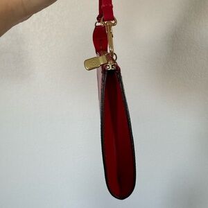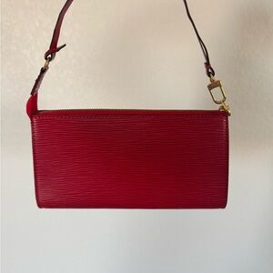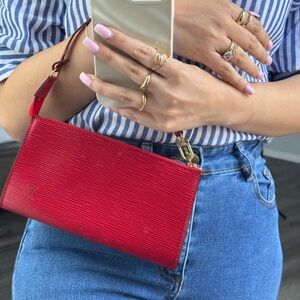 Chic Louis Vuitton clutch in cherry red. Sleek design with gold accents. Perfect for evening outings.