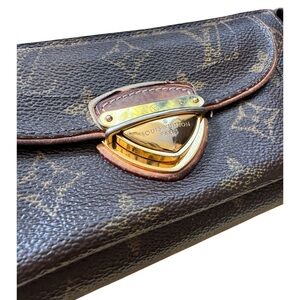 Chic Louis Vuitton clutch with iconic monogram. Features a gold clasp and front pocket.