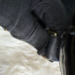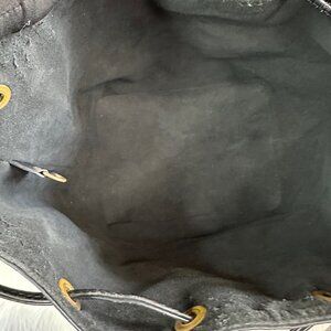 Hardware has tarnish. Wrinkling from storage. Interior shows minor signs of use, such as, very small amount of pilling at the top interior. Pull string has minor rubbing from adjusting.