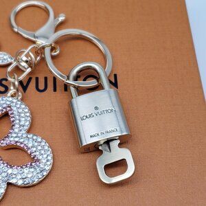 Elegant clover keychain featuring a stylish Louis Vuitton padlock charm. Perfect for adding a touch of luxury to your accessories.