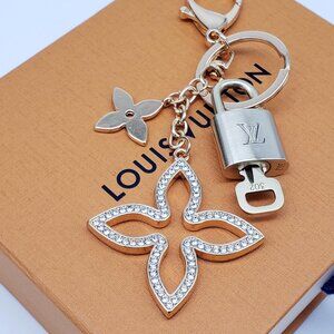 Elegant clover keychain featuring a stylish Louis Vuitton padlock charm. Perfect for adding a touch of luxury to your accessories.