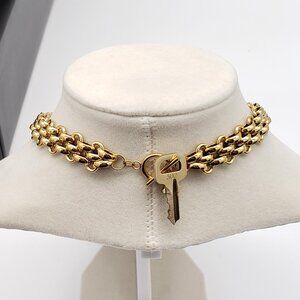 Luxurious and elegant stainless steel gold plated chain necklace featuring a louis vuitton padlock pendant. Perfect for adding a touch of luxury to any outfit daily.