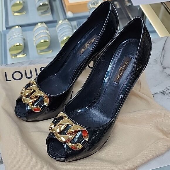 Authentic Louis Vuitton Green Vernis & Gold Peep Toe Pumps Heels shoes SZ 36