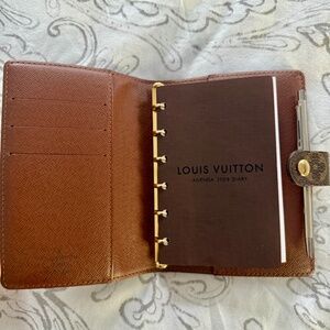 Authentic Louis Vuitton LV Small Ring Agenda Cover Planner Monogram PM + box/dustbag/pen/insert. This compact agenda cover in Monogram canvas can hold three credit cards. It can be used as an address book, notepad or calendar.