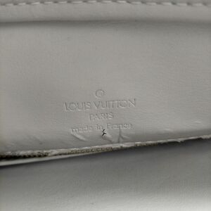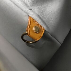 Note - this a pre-owned, pre-loved, older bag with signs of age / wear and use. There are discolored spots on the leather handles, and several stains and markings throughout on the bag itself. There is light peeling at the trim and on the interior, near the side wall zipper pocket and near the top seam.