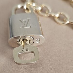 Add a touch of iconic luxury to your look with this stunning statement piece. This authentic (100% guaranteed genuine) Louis Vuitton lock with key (#302) is paired with a chunky, unbranded, 18", 14k gold necklace.