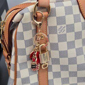 Elegant keychain featuring a stylish Louis Vuitton padlock charm. Perfect for adding a touch of luxury to your accessories.