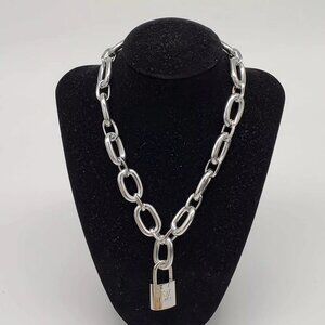 Luxurious and elegant silver plated chain necklace featuring a Louis Vuitton padlock pendant. Perfect for adding a touch of luxury to any outfit daily.