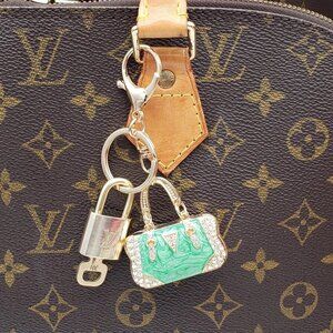 Elegant bag keychain featuring a stylish Louis Vuitton padlock charm. Perfect for adding a touch of luxury to your accessories.