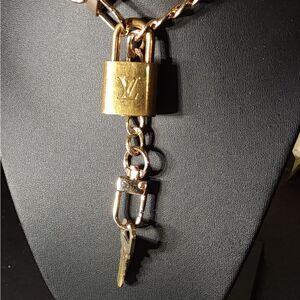 This listing is for an Authentic Louis Vuitton Lock and Key, it comes with an unbranded 24in chain. You can wear the Lock as a necklace with the chain or take it off and use it on your LV bag. Lock has scuffs and marks from age and use. Comes with the original key, Lock works as intended.