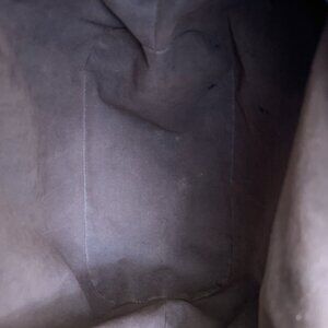 * Suede lining on the bottom, sides, and walls has multiple small stains: semi-transparent whitish marks, ink spots, and pen marks