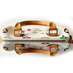This is an authentic LOUIS VUITTON Multicolor Mini Sac HL Speedy Bag in White. This multicolore monogram was created by Japanese pop artist Takashi Murakami and is here featured in this charming mini Speedy in white. The baguette features vachetta cowhide rolled leather top handles with brass links and zipper closure with a brass padlock. The zipper opens to a raspberry microfiber interior with room for essentials with the luxury and style from Louis Vuitton!