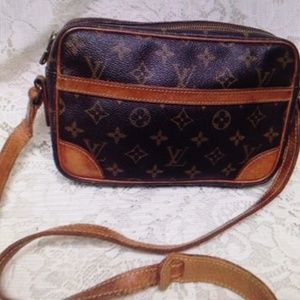 This is a beautiful pre-owned handbag or crossbody made of brown monogram coated canvas with leather trim. It measures 9 inches long, 6 inches wide and 2.5 inches thick. It is in good condition with normal age wear such as soiling, discoloration, metal wear, wear on leather strap and trims, scratches on leather trim and inner lining as shown in photos. It comes with shoulder- crossbody strap. Please supersize photos for condition details. It is marked: Louis Vuitton, Paris, Made in France.