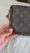 Vintage Louis Vuitton Pochette with iconic monogram pattern. Features a brown leather strap.