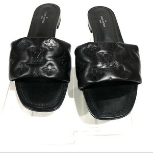 Description: Authentic pillow like lambskin leather sandals. These are very stylish sandals in a very durable leather. I prefer buying the leather versions of Louis Vuitton, as too much canvas cracks. I purchased some more Chanel slides so I no longer wear these.