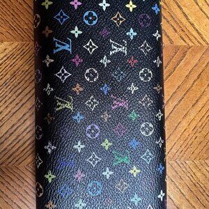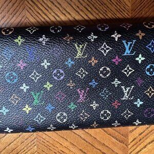 This Louis Vuitton wallet features a striking multicolor design on a black background. Perfect for adding a touch of luxury to your everyday essentials.