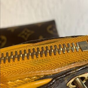 LOUIS VUITTON Monogram Pallas Saffron. This chic tote is crafted of Louis Vuitton monogram on toile canvas with wide sides that gather and pleat. The bag features rolled vachetta cowhide leather top handles with brass links, a monogram toile optional shoulder strap with brass clasps, large brass clasp loops, and a peek-a-boo top of saffron leather. Additional pics in next listing. Pallas will come with a LV dust bag. Sold only as a bundle with wallet. 10x13x5.25