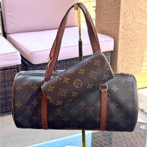 The is handbag is crafted of Louis Vuitton monogram coated canvas with brown cross grain leather trim and straps. The brass top zipper opens to a brown cross-grained leather interior with a removable pochette.