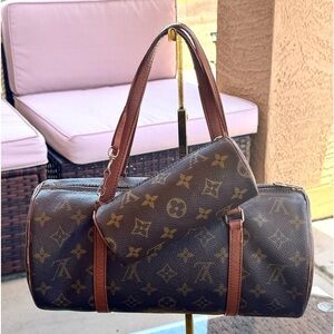 The is handbag is crafted of Louis Vuitton monogram coated canvas with brown cross grain leather trim and straps. The brass top zipper opens to a brown cross-grained leather interior with a removable pochette.