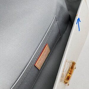 This chic baguette is crafted of Louis Vuitton monogram embossed vernis patent leather in off-white. The bag features a vachetta cowhide leather strap with brass links and a front-facing flap with a pointy Koala push-lock. The flap opens to a light grey fabric interior.