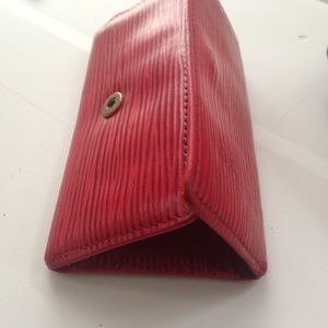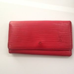 This is a pre-owned 4 hooks key case made of red Epi leather. This key cas has a slot for folded bills, ID or Credit card. Folded it measures about 4.25 inches long and 2.25 inches wide. It is in good condition with normal signs of wear such as edge wear, discoloration, soiling, metal wear, etc. as shown in photos.