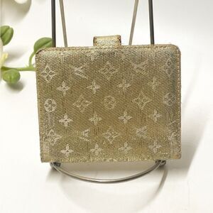 This Vintage Louis Vuitton gold shimmering monogram fabric card wallet has a rich patina on the fabric, giving it a distinguished, well-loved look. The gold shimmer still catches the light beautifully, albeit with subtle signs of age. The edges show some scuffing and or wear, adding character to the piece. The interior is crafted with soft fine Lambskin leather.
