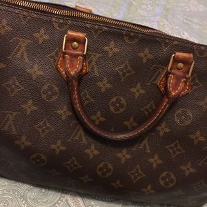 Handles darkened/great condition of canvas with no cracks or peeling /inside pocket not usable/pull tab on zipper has separated but zipper works smoothly :open to select trades