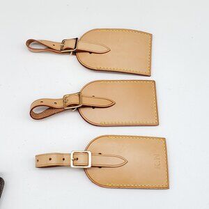 Tan leather luggage tags by Louis Vuitton. Elegant and durable design. -excellent condition - use for bag decoration - luggage name tags -price for 1 Nametag -1 Nametag Initial T.T. 100% Authentic or 100% Money Back Guaranteed!