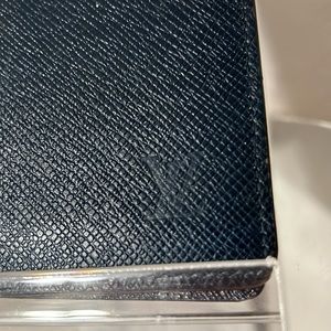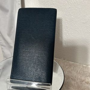 Beautiful preloved condition. Very little to call out on this one. Maybe slight wear at folds but no loss of stitching or separation. 17 card slots in excellent condition. One expandable pocket and 3 other slip pockets. Bright silver logo inside and visible date code. Visible LV on exterior. Beautiful deep navy color and the very durable Tiaga leather. Will list as men’s but perfect for women also.
