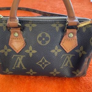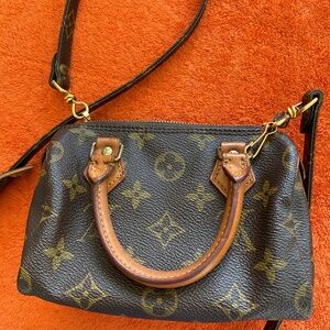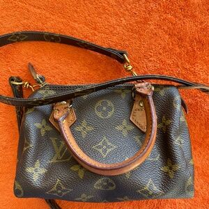 Authentic Vintage Louis Vuitton Speedy Nano. She's been used for sure. Has some aging. See photos for the leather that is worn.