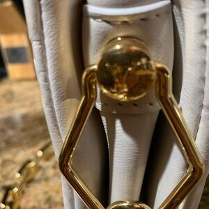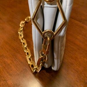 Sophisticated rare off white color, authentic Louis Vuitton clutch. Features white embossed leather. Accented with a gold chain strap. Like new . You can wear as a purse with long fabric belt( not shown) or as with chain in your arm or shoulder or as a clutch( golden chain can be dis attached)