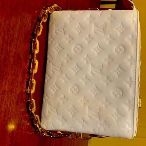 Authentic Louis Vuitton White Embossed purse with Gold Chain, rare cream color.