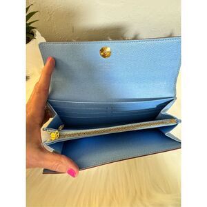 This Louis Vuitton White Murakami Sarah Wallet is in great condition. The interior is light blue with 10 card slots and a zipped compartment for coins. There is no coin residue in this compartment. This also comes with the dust bag and box.
