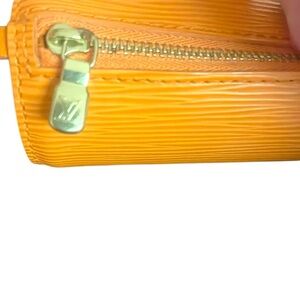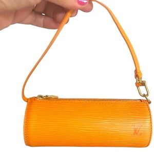 Baby Papillion in Epi orange leather gold hardware. Bag is in beautiful condition except for 2 callouts. The first callout is on the top of the handle, the second is under the handle. I’m not sure what it is, I believe it can be cleaned off but I don’t know how to do that and don’t want to mess it up. Price reflects wear.