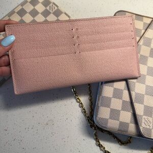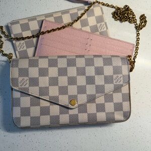 Authentic felicie pouchette. Good used condition no major flaws. I never have even used the inserts. Come make up marks on inside as shown in photos but nothing major. No smells. Prove firm on here due to fees. Better price IG @loveoflouisv
