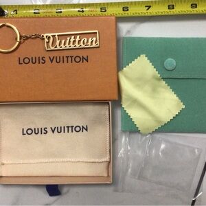 Authentic Louis Vuitton gift box & dust pouch 🌹 excellent condition no rips or tears. With this purchase you get everything in the photo. Including the brand new gold faux keychain key ring, key fob bag charm. Box approximately 5 1/2 x 3 1/2. Keychain from end to end approximately 4 1/2. The gold name Vuitton is approximately 2 1/4 inches long.