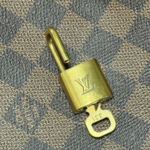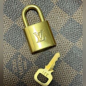 The product is an authentic Louis Vuitton lockset which includes a lock and key #331 in a gold color. The key chain is unisex and would be a luxurious accessory for anyone looking to add a touch of elegance to their belongings. This item is a stylish and practical accessory that showcases the high-quality craftsmanship and design synonymous with the Louis Vuitton brand.