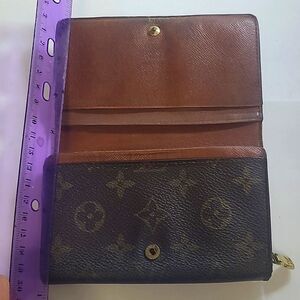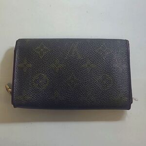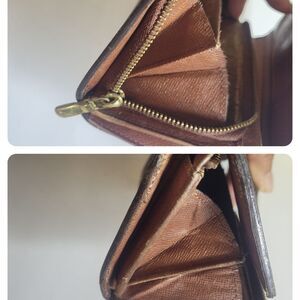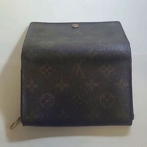 The outer leather showed wearing with scratches, curling edges, cracks on corners & aging. The hardwares are tarnished. Zipper runs smoothly. Inside wallet showed wearing also with scratches, stains, marks, 3 billfold, 1 coin pocket ( dirt stains, peels, marks inside pockets, plz review all the photos). Please review the last photo for date code. It made in France. Dimensions ( approx) 5.25, 3.5, & 1". No trade.