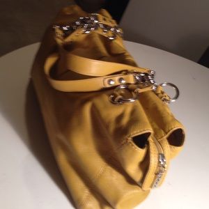 Dijon mustard color. Leather exterior silver hardware. Zip closure. Leather leather & link chain 9' straps. Zip & slip pockets inside lining. Ink marks inside. Exterior Minor ink marks near zipper. Can't see when carrying. Overall good condition. Nice bag.