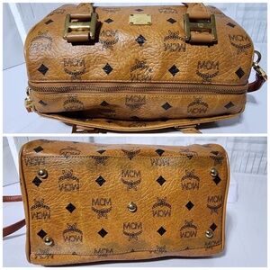 This authentic MCM Monogram Visetos Boston Bag Cognac is in it’s good pre-owned condition. The exterior is clean and beautiful. Interior is clean. The top handle shows rubbing wear to it. The long strap is for a vintage MCM bag.