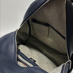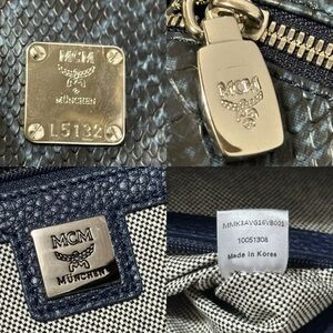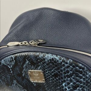 Elegant MCM backpack in blue and silver. Features durable leather and secure zip closure.