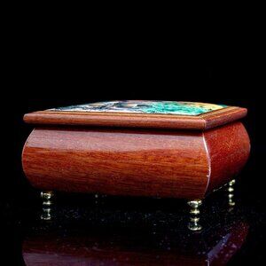 This exquisite Ercolano music box, handcrafted in Sorrento, Italy, features a charming M.J. Hummel figurine design. With a Swiss movement mechanism, it ensures delightful melodies. The rich wood finish and velvet-lined interior make it both a functional and decorative piece, ideal for storing small treasures.