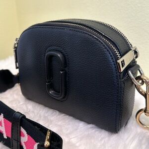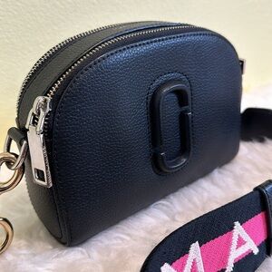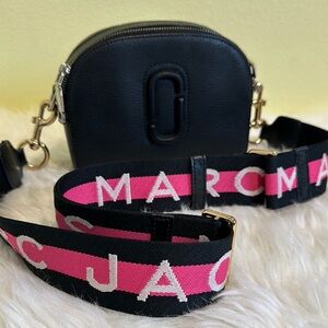 Stylish black crossbody bag with a bold pink strap. Features Marc Jacobs branding.