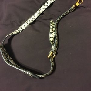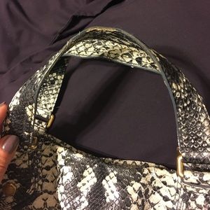 Large black and white Marc Jacobs snake skin print Francesca Tote. Gold hardware. Top handles with square rings, 7" drop and removable shoulder strap. Open top with magnetic button closure. Front "Standard Supply" logo plate. Logo-print canvas lining. Inside, one zip pocket and two open pockets.