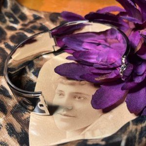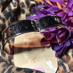 Edgy, Sophisticated, Uber Cool! This gorgeous bracelet is silver plated, hinged with a push button clasp and beautiful black enamel fill to accentuate the brand name that appears around the face of the bracelet.